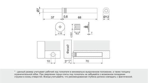 Сильная пружина толкателя позволяет выталкивать даже тяжелые и крупные фасады минимум на 37 мм.