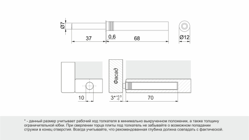 Толкатель врезной Push-to-Open скрытого монтажа BOYARD AMF14/GRPH – классический компаньон мебели без ручек, он предназначен для распашных фасадов на петлях с пружиной. Способен выталкивать даже тяжелые и крупные фасады на 37 мм. Обладает регулировкой расстояния зазора между наконечником толкателя и фасадом в закрытом положении +5 мм.