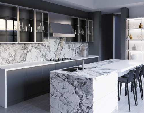 Декор имитирует мрамор Invisible Grey Gold. Это разновидность многоцветного мрамора, который добывается в Бразилии. Благодаря неповторимому рисунку, разнообразию оттенков и полутонов, мрамор органично вписывается не только в классические, но и в современные интерьеры.