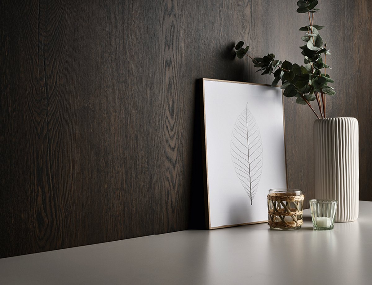 Фасады из ДСП EGGER с покрытием PerfectSense воплощают эстетику тёмного дуба с выразительной текстурой.