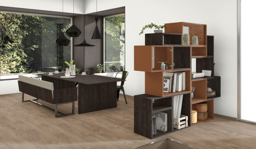 Несмотря на достаточно тёмный цвет, древесина, подвергнутая термической обработке, часто демонстрирует красивые и естественные переходы цветовых оттенков. Так цветовая гамма декора Дуб термо чёрно-коричневый включает в себя и светлые, и средние оттенки натуральных цветов, и поэтому его очень хорошо комбинировать как с белыми и светлыми однотонными декорами, декорами землистых и сероватых оттенков, так и с бежевыми декорами. На тёмных декорах структура ST12 Поры матовые смотрится особенно приятно и сдержанно, что ощущается к тому же и при прикосновении.
