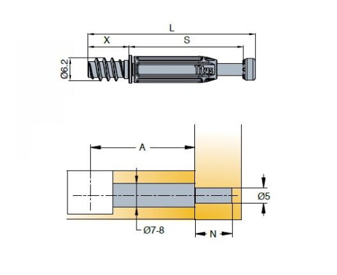 Дюбель с большим сопротивлением кручению и вырыванию. Можно использовать со всеми эксцентриками System 5 (Cam2000, Cam3000 и CAM5000). Длина резьбы 11 мм, глубина сверления 12 мм. Пластиковая юбка упрощает этап установки и обеспечивает дополнительную плотность соединению.