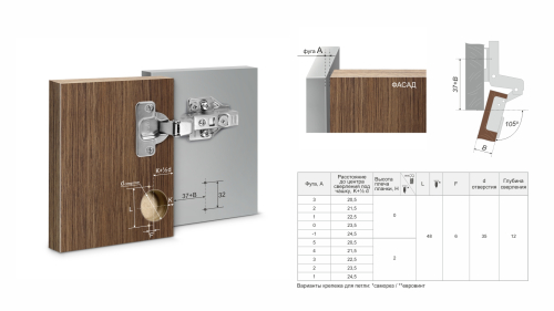 Стильная, удобная петля, с «европейской внешностью» и встроенным в корпус эксцентриковым винтом, который позволяет плавно, в одно действие, отрегулировать глубину положения фасада.