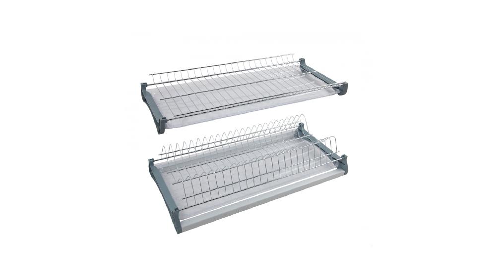 Комплект сушки включает 2 яруса для хранения посуды с надёжным гальваническим покрытием с эффектом хромирования, 2 съёмных поддона из качественного бесцветного пластика, 4 пластиковых серых держателя нижнего и верхнего уровней, переднюю и заднюю алюминиевые трубки, саморезы для монтажа сушки и крепления трубки.