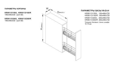 Примечание: корзина поставляется без направляющих — их необходимо приобретать отдельно в соответствии с требуемой стороной установки (левой или правой).
