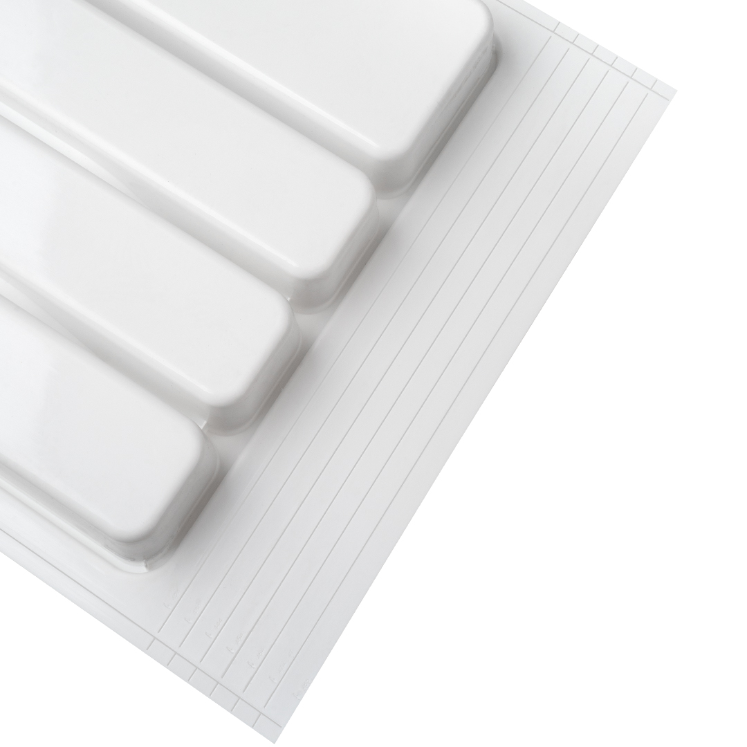 Стильные и продуманные емкости для столовых приборов с матовой бархатистой поверхностью, кроме приятных тактильных ощущений, гарантируют отличные эксплуатационные характеристики и снижение уровня шума. С обратной стороны поверхности нанесена линия реза по типовым размерам ящика.