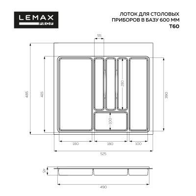 Универсальный обрезной лоток для столовых приборов в ящик корпуса 600мм. Насечки с трех сторон: по ширине разметка 510, 525мм, по глубине 424, 434,444, 454,464, 474, 485мм.