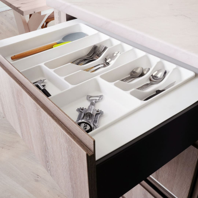 Оптимальное решение для организации пространства в ящике. Стильные и продуманные емкости для столовых приборов с матовой бархатистой поверхностью, кроме приятных тактильных ощущений, гарантируют отличные эксплуатационные характеристики и снижение уровня шума. С обратной стороны поверхности нанесена линия реза по типовым размерам ящика.