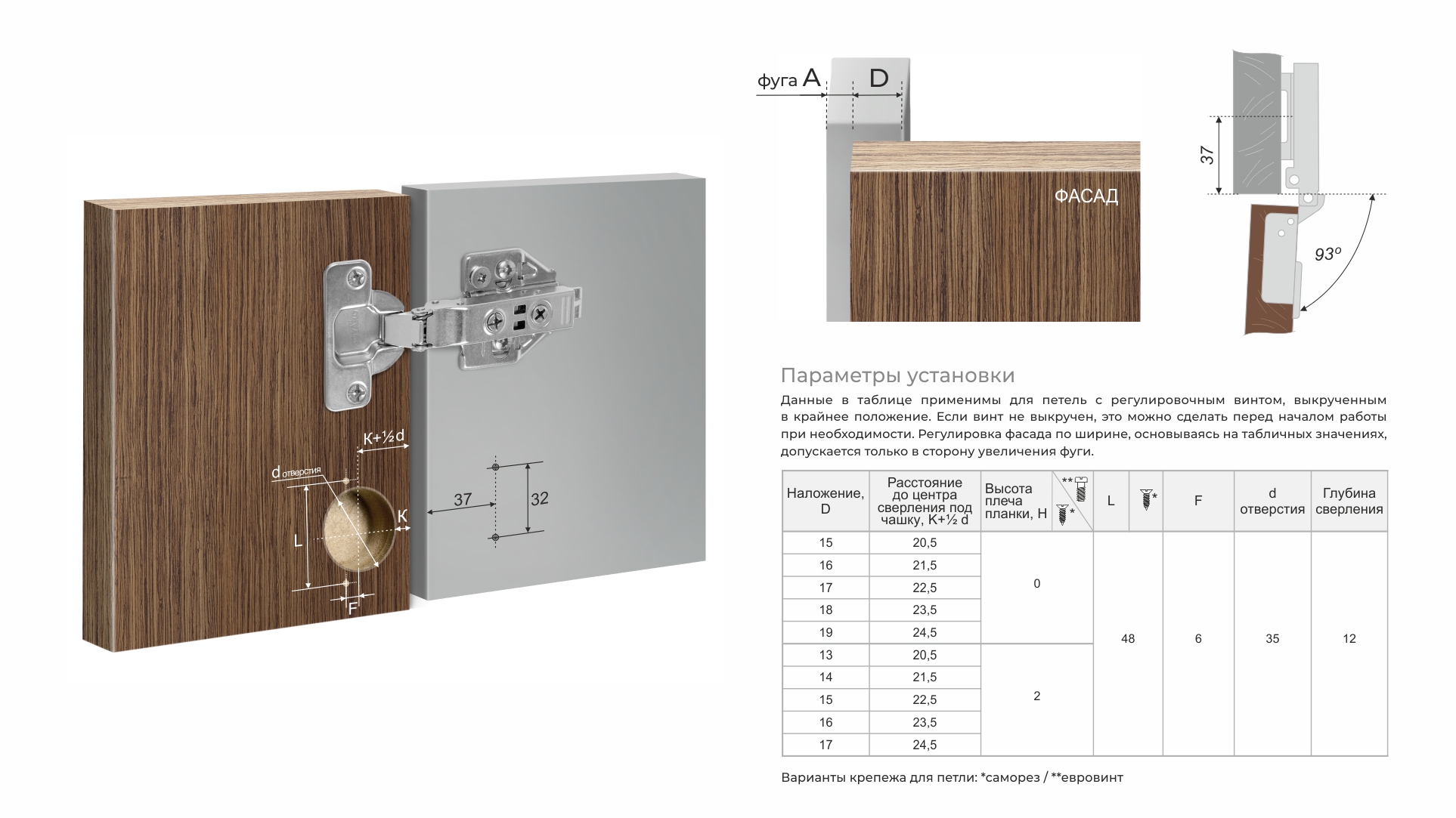 Для более прочного соединения с плитой при креплении петель и ответных планок саморезами рекомендуется использовать футорки F04/01/10*12W/0.
