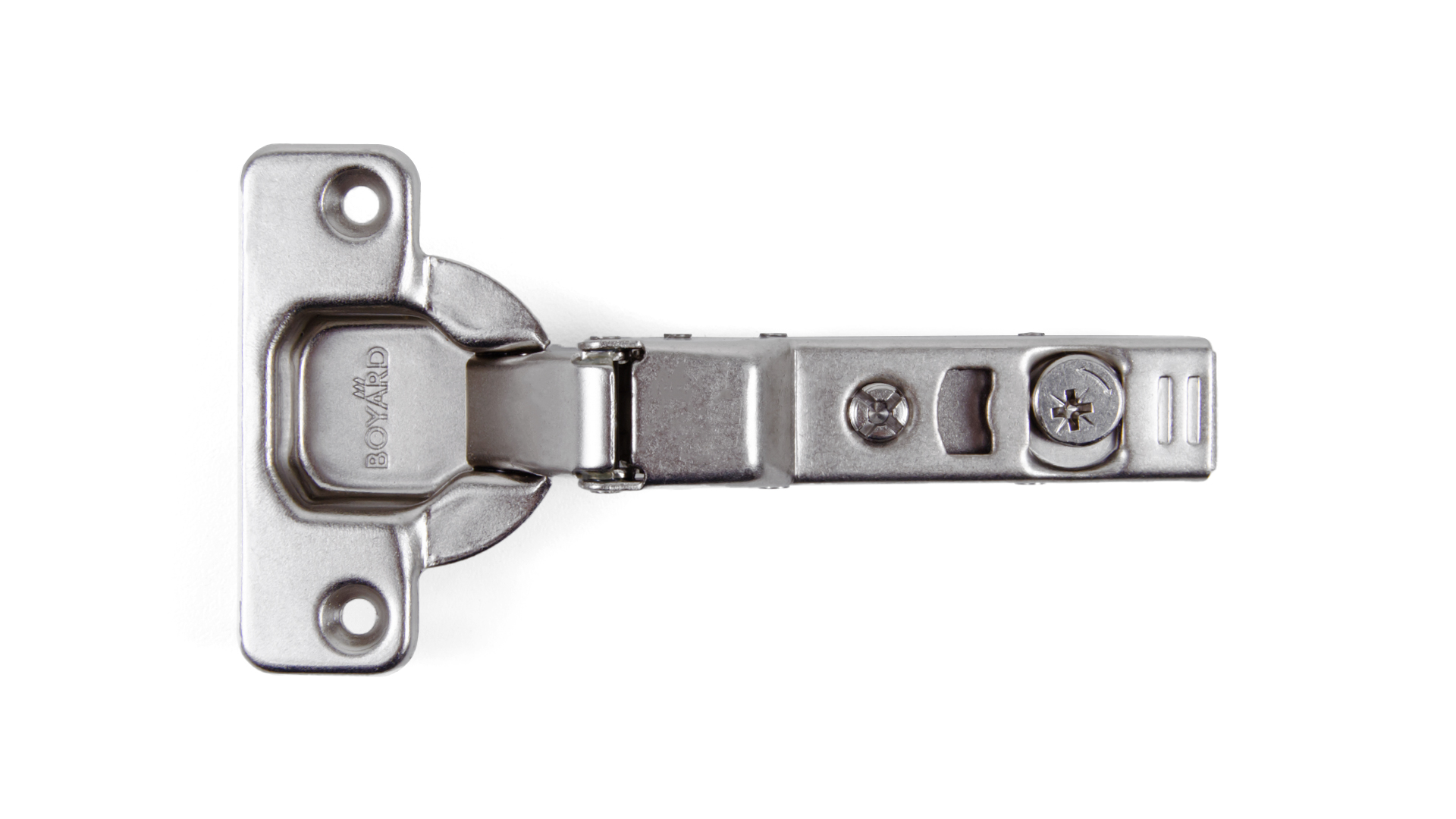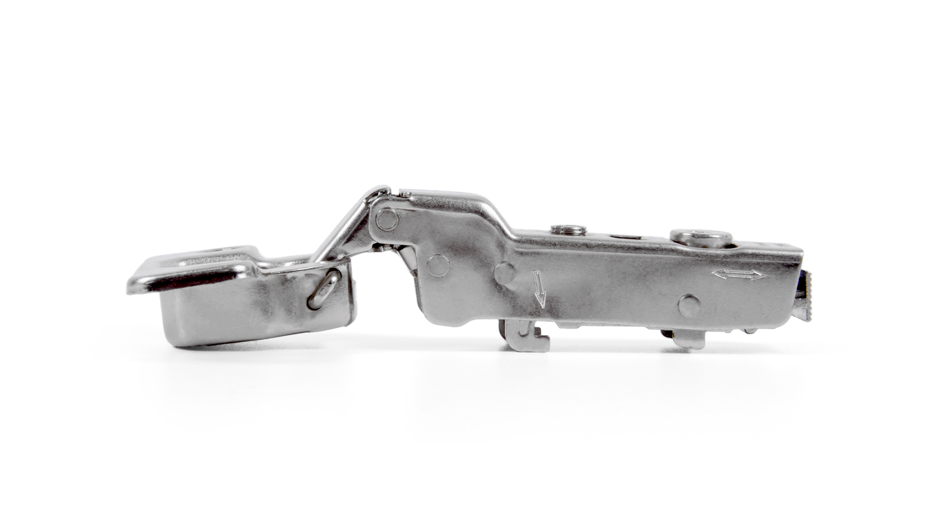 Модель имеет регулировку фасада в трёх плоскостях (по глубине, горизонтали и вертикали). Удобная регулировка по высоте и глубине в одно действие осуществляется при помощи эксцентрикового винта, встроенного в корпус петли. Регулировка фасада по горизонтали доступна при помощи винтов на планке.