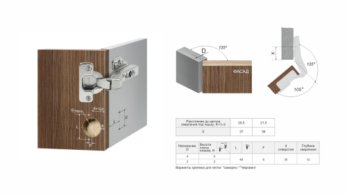 Модель для угловых модулей, с углом установки 135° относительно внутренней поверхности боковой стенки. Модель предназначена для крепления фасадов толщиной до 22 мм и имеет все характеристики современной петли – европейский дизайн и улучшенный функционал.