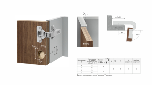 Одноходовая петля для углового модуля с углом установки 180° относительно внутренней поверхности фальш-панели. Как и ее «сестра» - петля Н642, - модель предназначена для крепления фасадов толщиной до 22 мм.