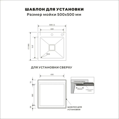 Размеры мойки: 50 × 50 см (длина × ширина).