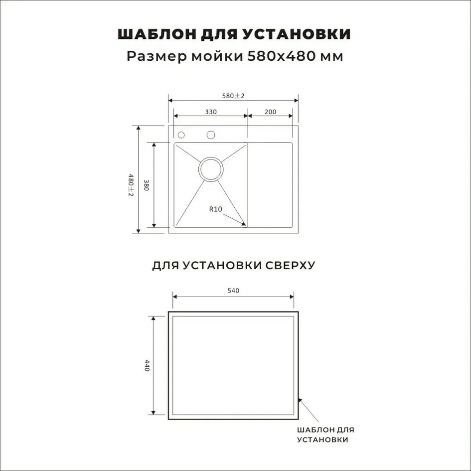 Размеры мойки: 58 × 48 см (длина × ширина).