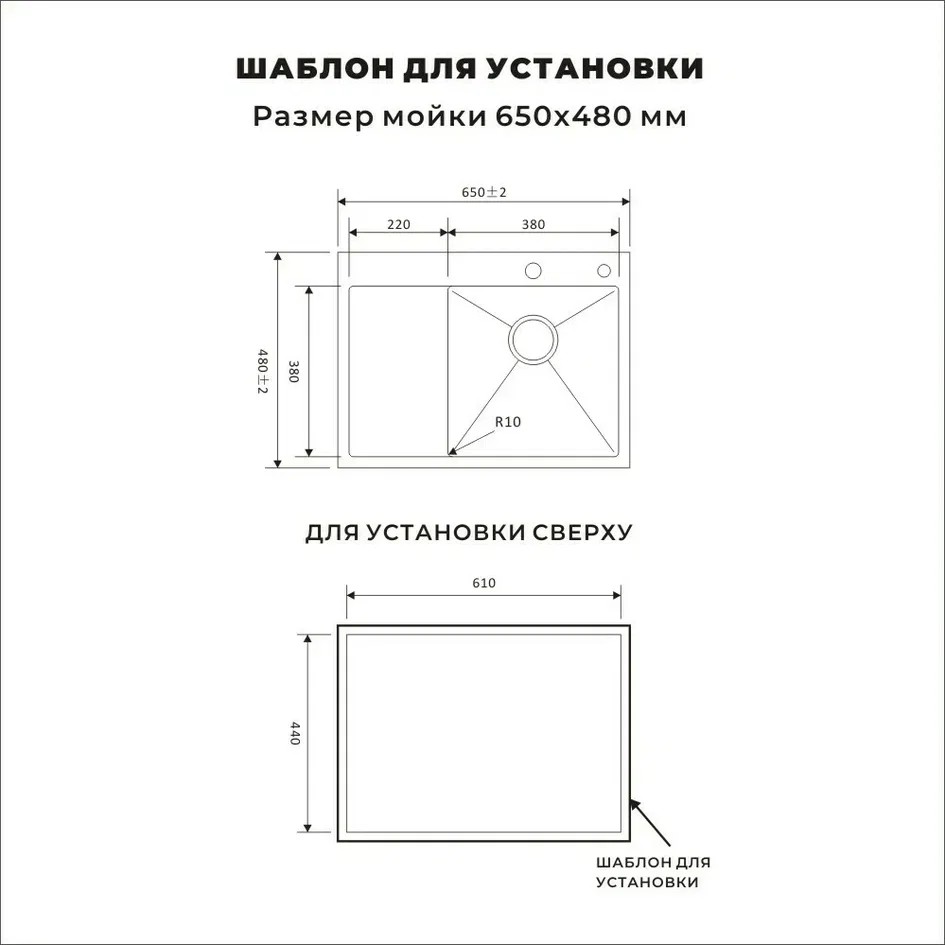 Размеры мойки: 65 × 48 см (длина × ширина).