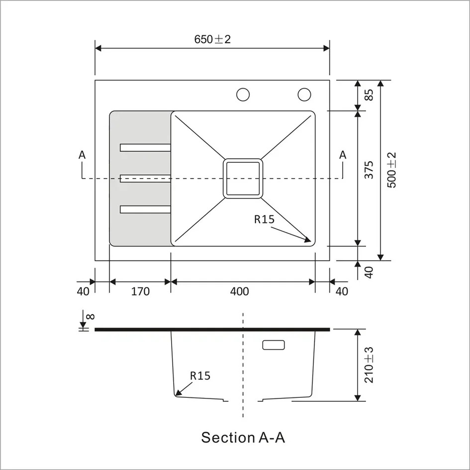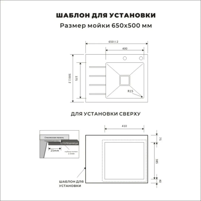 Размеры мойки: 65 × 50 см (длина × ширина).