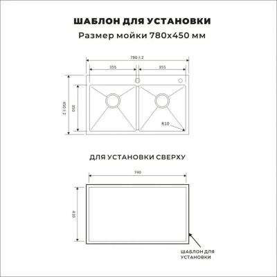 Кухонная мойка 780 × 450 мм с двумя чашами в цвете «Нано‑Сатин» — функциональная модель из нержавеющей стали с инновационным нано‑покрытием.