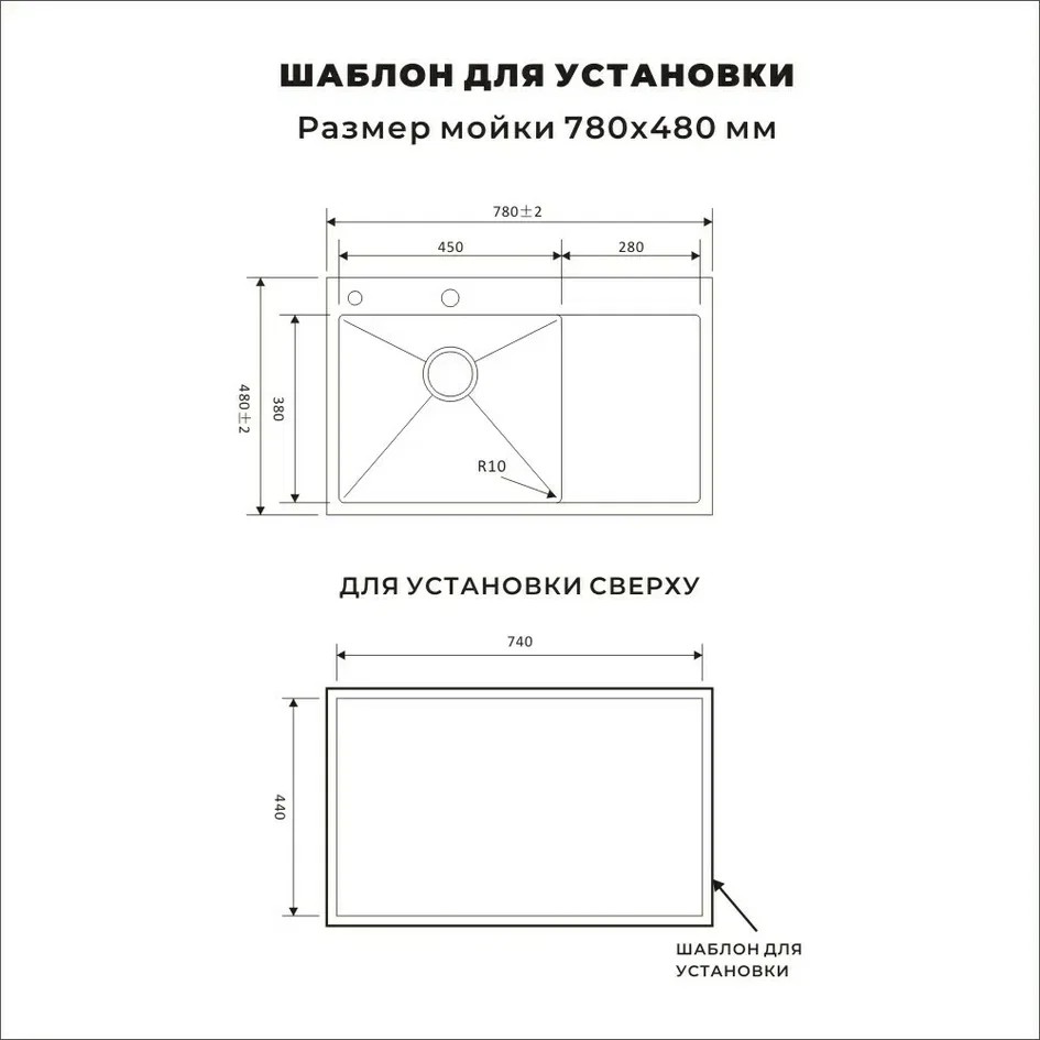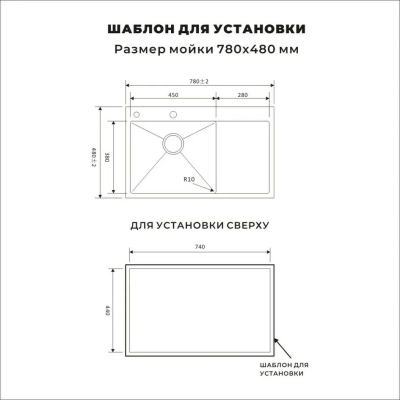 Размеры мойки: 78 × 48 см (длина × ширина).