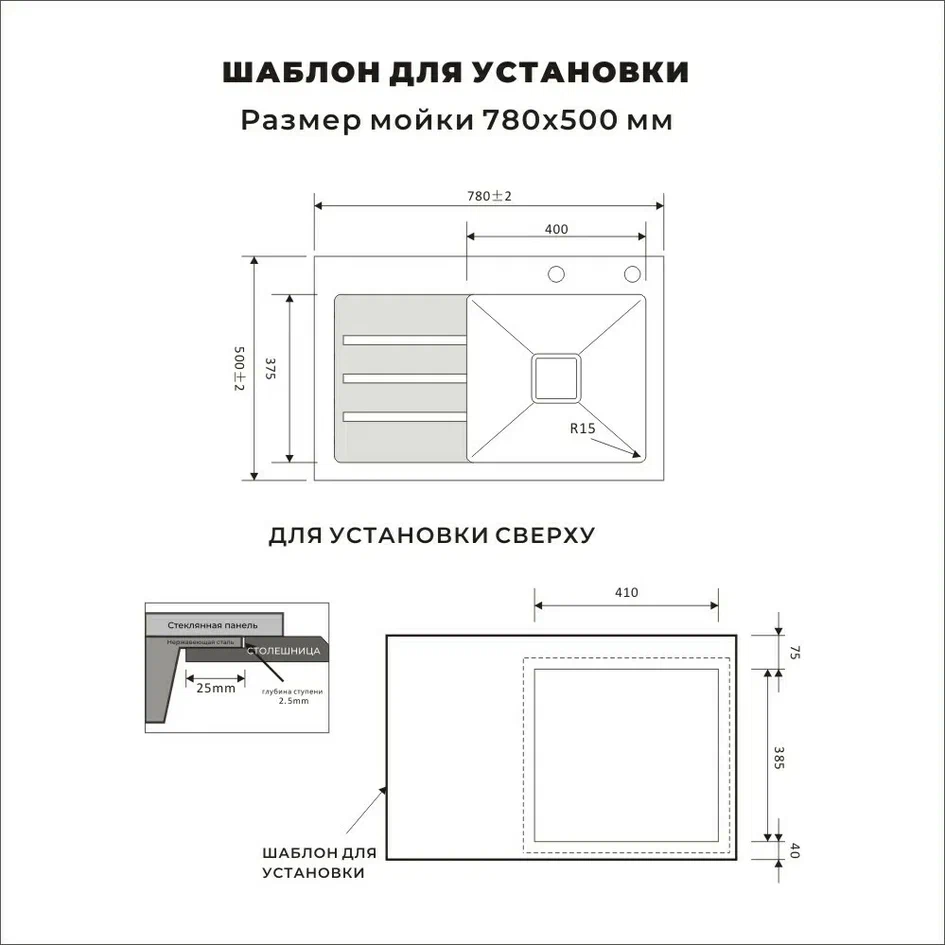 Размеры мойки: 78 × 50 см (длина × ширина).