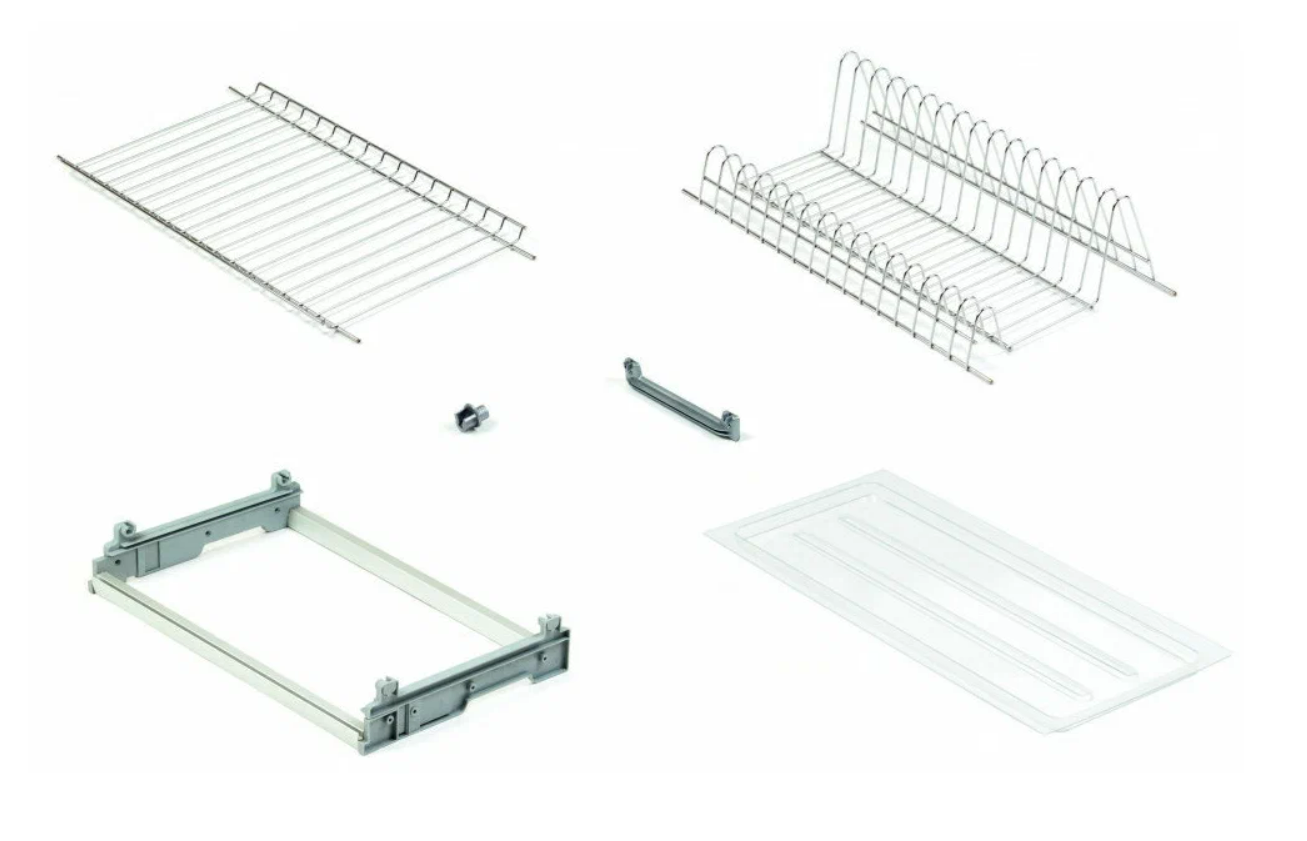 Комплектующие: держатель посудосушителя для поддона: 1 комплект, рамка телескопическая, поддон пластиковый: 2шт.