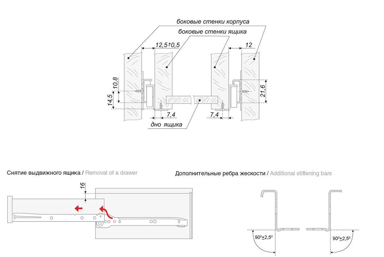 Направляющие роликовые для мебельных ящиков. Выдвижной механизм одинарный, неполного выдвижения, с самозатягиванием, двойным остановом и защитой от выкатывания. Ролик цельный, материал ролика ABS.