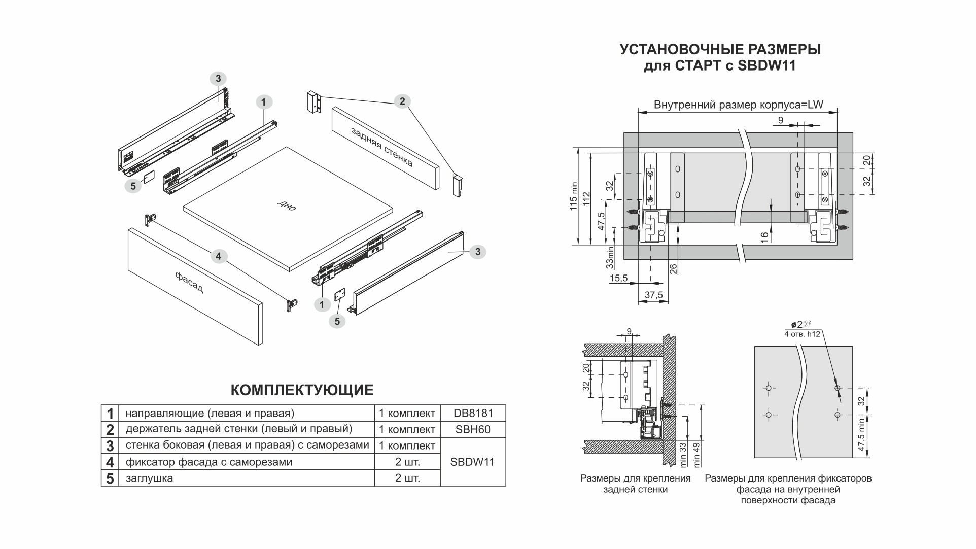 Для сборки выдвижного мебельного ящика на базе СТАРТ СОФТ SB18 необходимо самостоятельно изготовить фасад, заднюю стенку и дно ящика.