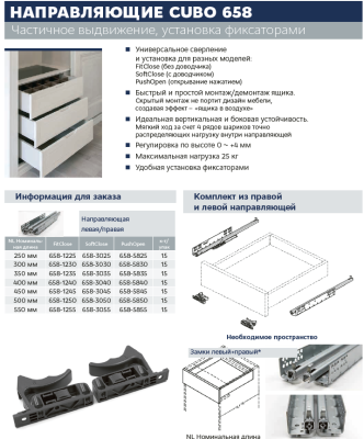 Направляющие скрытого монтажа с частичным выдвижением 3/4 и системой плавного закрывания SoftClose. Обеспечивают комфортное использование выдвижных ящиков с бесшумным закрыванием.