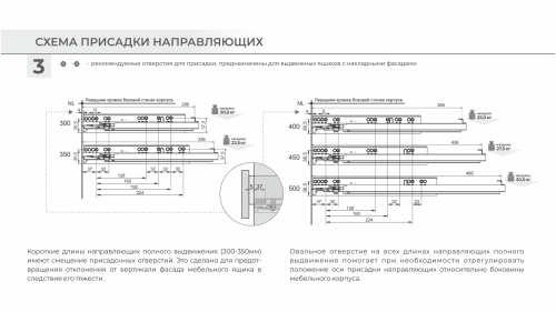 В коротких длинах направляющих DB8785 (250-350 мм) предусмотрено смещение оси присадочных отверстий. Это обеспечивает точное и плотное прилегание фасадов к боковинам мебельного корпуса, даже если неглубокий выдвижной ящик устанавливается с габаритными, высокими фасадами.
