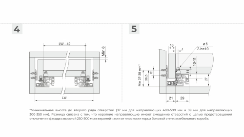На всех длинах добавлено овальное отверстие, которое позволяет, при необходимости, дополнительно отрегулировать оси присадки направляющих относительно боковины мебельного корпуса. Модель взаимозаменяема с DB8885.