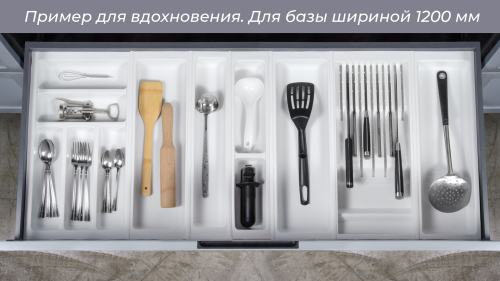 PC14 — многосекционный поддон из экологичного полипропилена, необходим для хранения столовых приборов. Является обязательным образующим элементом для формирования любой комбинации поддонов линейки BLӦKI для выдвижных мебельных ящиков глубиной 500 мм и шириной от 500 мм.