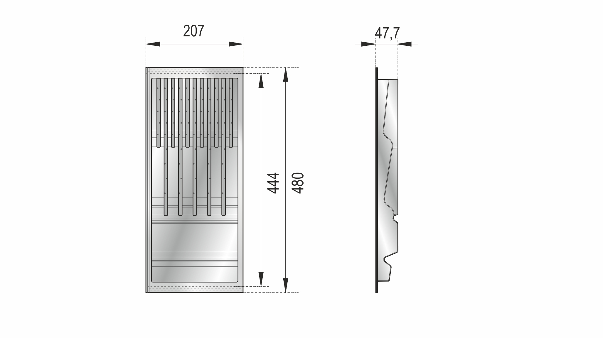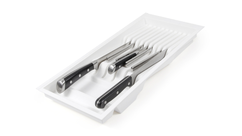 PC15 — поддон из экологичного полипропилена, необходим для хранения ножей разных габаритов. Является составным элементом для формирования индивидуальной комбинации поддонов линейки BLӦKI для выдвижных мебельных ящиков глубиной 500 мм и шириной от 700 мм.