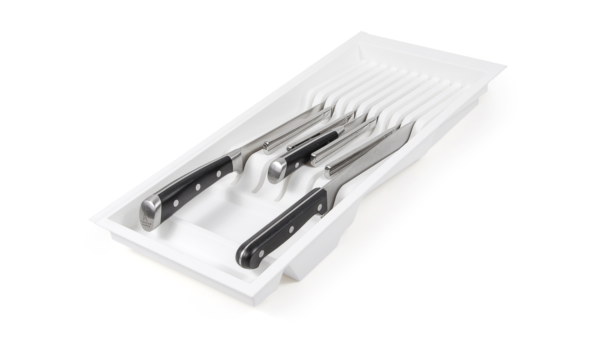 Эргономичная конструкция поддона рассчитана на размещение 5 больших и 6 маленьких ножей.
