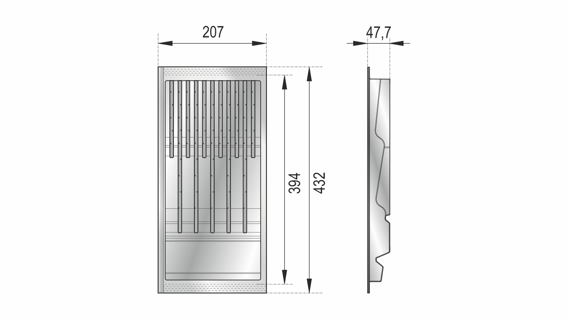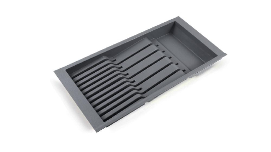 PC15 — поддон из экологичного полипропилена, необходим для хранения ножей разных габаритов. Является составным элементом для формирования индивидуальной комбинации поддонов линейки BLӦKI для выдвижных мебельных ящиков глубиной 450 мм и шириной от 700 мм.