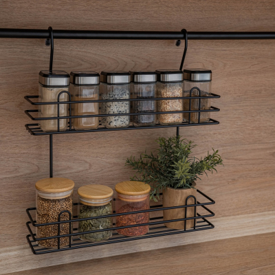 Полка помогает рационально использовать пространство на стене, освобождая рабочую поверхность. На двух ярусах удобно разместить специи, соусы и другие кухонные мелочи — всё будет под рукой. Прочная конструкция гарантирует долговечность использования.