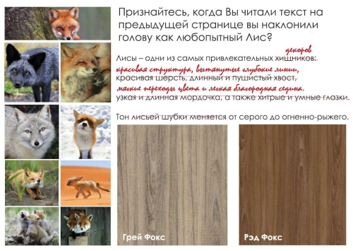 Лисы - одни из самых привлекательных декоров: красивая структуры, вытянутые глубокие линии, мягкие переходы цвета и мягкая благородная седина. Тон меняется от серого до огненно-рыжего.