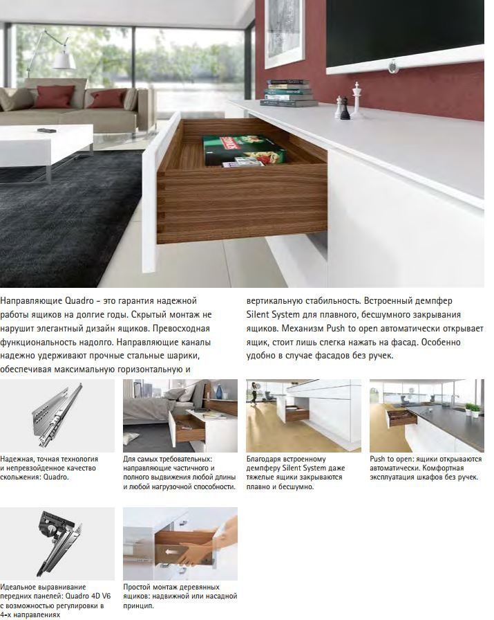 • Взаимозаменяемость компонентов системы – замена Quadro частичного выдвижения на Quadro полного выдвижения без изменений размеров корпуса, ящика и передней панели.