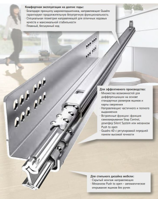 • Взаимозаменяемость компонентов системы – замена Quadro частичного выдвижения на Quadro полного выдвижения без изменений размеров корпуса, ящика и передней панели.