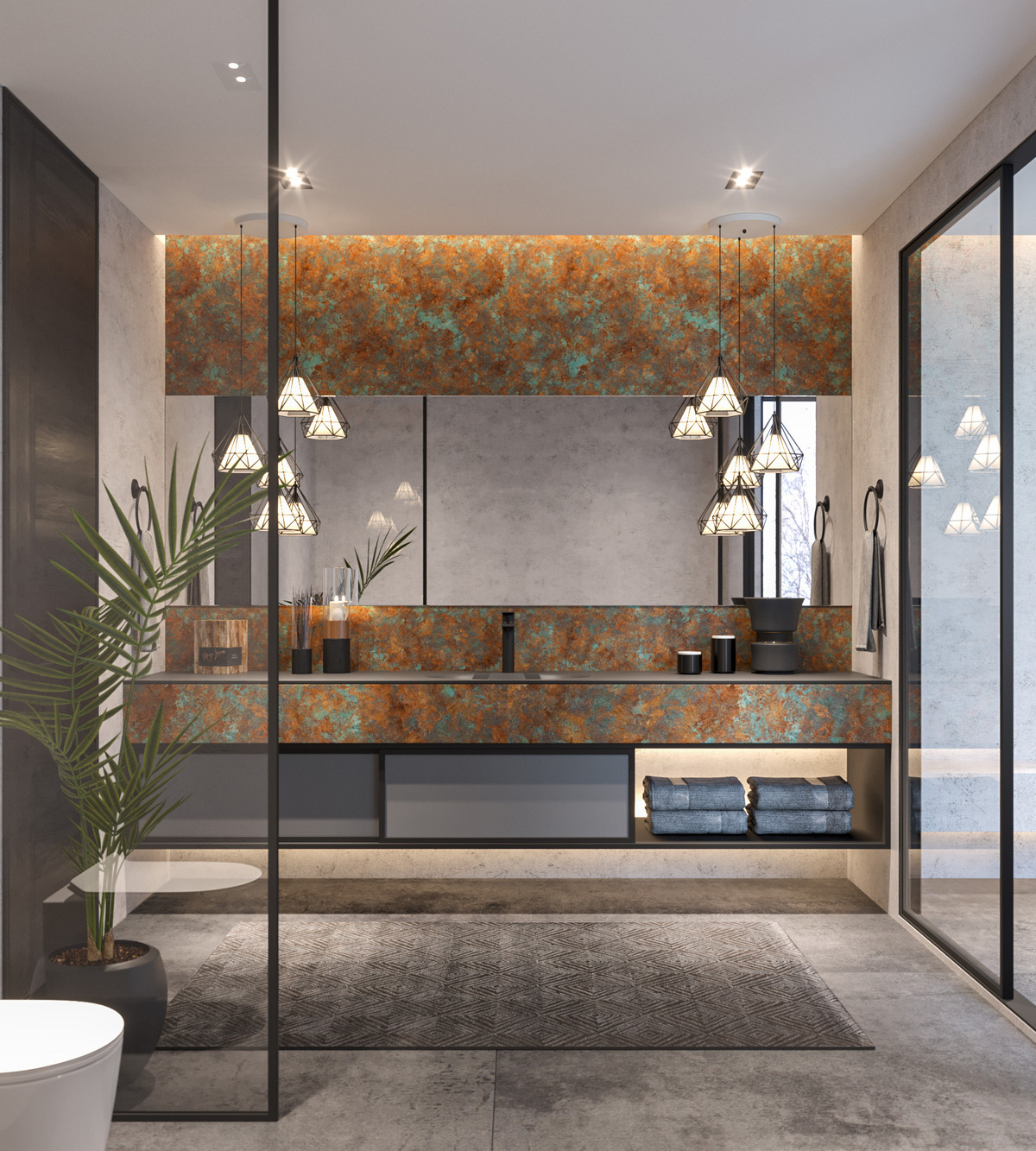 рельефная структура с неравномерной текстурой, воспроизводящей эффект состаренной меди и лёгкой ржавчины;