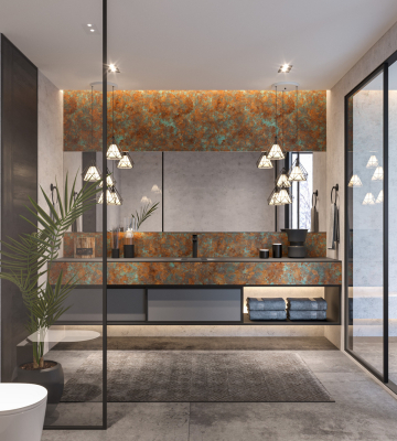 декоративное исполнение: «Старинная медь‑8721» — выразительный декор с эффектом ржавчины и окисления металла, создающий богемное, винтажно‑современное звучание интерьера;