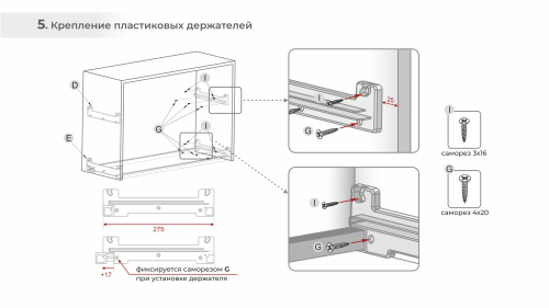 Регулируемый нижний держатель допускает установку в короб с внутренней глубиной от 280 мм и монтаж задней стенки 4 мм в паз.